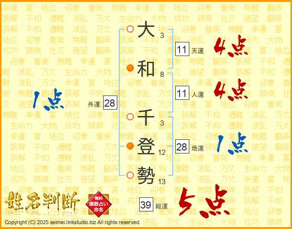 大(3画)和(8画) 千(3画)登(12画)勢(13画)