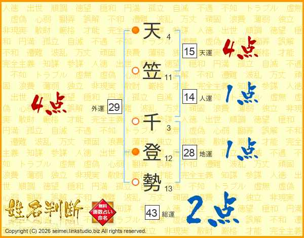 生活面を象徴する運勢です。外部から受ける影響力を表し、結婚運、家庭運や職場、環境への順応性を表します。総運から人運を引いた画数。姓や名が1文字の場合を除く。