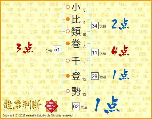 生活面を象徴する運勢です。外部から受ける影響力を表し、結婚運、家庭運や職場、環境への順応性を表します。総運から人運を引いた画数。姓や名が1文字の場合を除く。