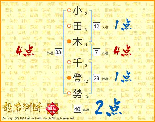 生活面を象徴する運勢です。外部から受ける影響力を表し、結婚運、家庭運や職場、環境への順応性を表します。総運から人運を引いた画数。姓や名が1文字の場合を除く。
