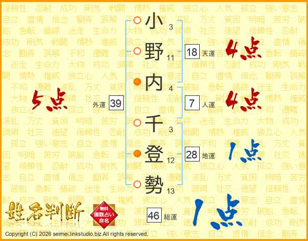 小野内千登勢さんの総運は46画の1点!