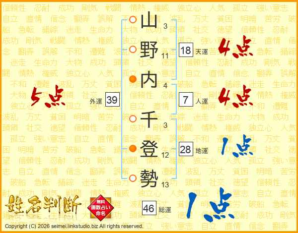山(3画)野(11画)内(4画) 千(3画)登(12画)勢(13画)