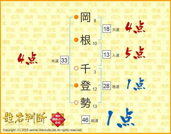 岡(8画)根(10画) 千(3画)登(12画)勢(13画)
