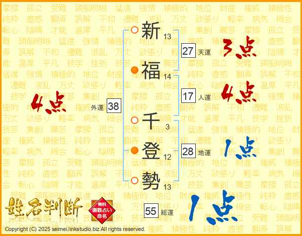 新(13画)福(14画) 千(3画)登(12画)勢(13画)