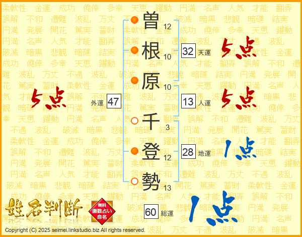曽(12画)根(10画)原(10画) 千(3画)登(12画)勢(13画)