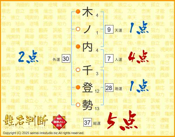 木(4画)ノ(1画)内(4画) 千(3画)登(12画)勢(13画)