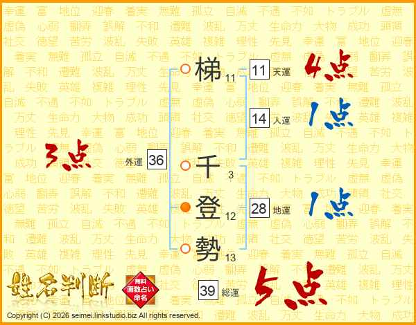 梯千登勢さんの総運は39画の5点!