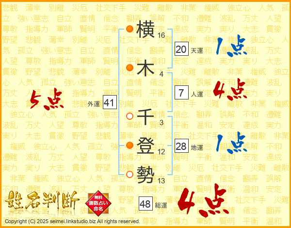 横(16画)木(4画) 千(3画)登(12画)勢(13画)