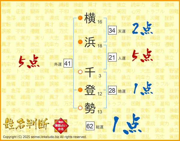 横(16画)浜(18画) 千(3画)登(12画)勢(13画)