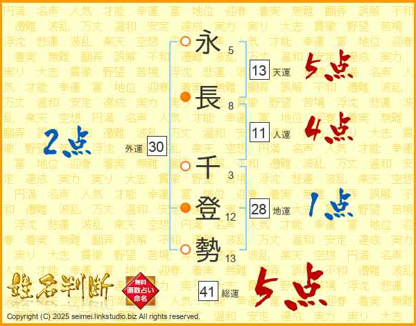 永(5画)長(8画) 千(3画)登(12画)勢(13画)