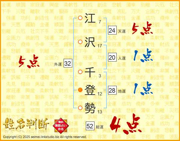 江(7画)沢(17画) 千(3画)登(12画)勢(13画)