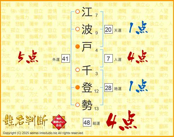 生活面を象徴する運勢です。外部から受ける影響力を表し、結婚運、家庭運や職場、環境への順応性を表します。総運から人運を引いた画数。姓や名が1文字の場合を除く。