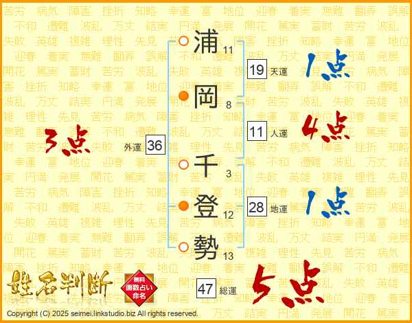 浦(11画)岡(8画) 千(3画)登(12画)勢(13画)