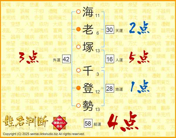 生活面を象徴する運勢です。外部から受ける影響力を表し、結婚運、家庭運や職場、環境への順応性を表します。総運から人運を引いた画数。姓や名が1文字の場合を除く。