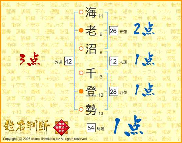 海(11画)老(6画)沼(9画) 千(3画)登(12画)勢(13画)