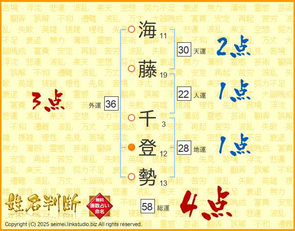 海(11画)藤(19画) 千(3画)登(12画)勢(13画)