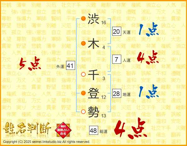 渋(16画)木(4画) 千(3画)登(12画)勢(13画)