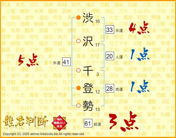 渋沢千登勢さんの外運は41画の5点!