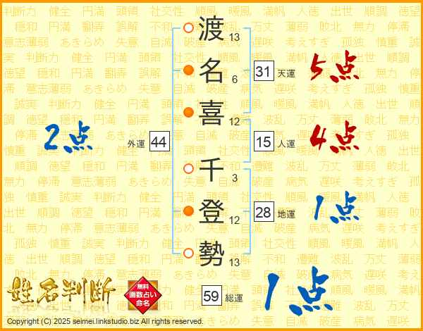 渡(13画)名(6画)喜(12画) 千(3画)登(12画)勢(13画)