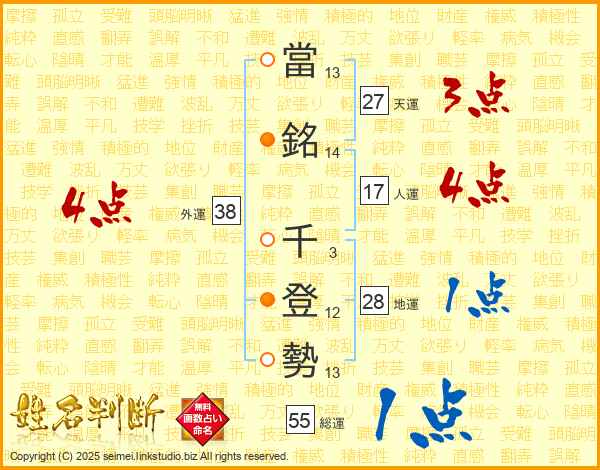 當(13画)銘(14画) 千(3画)登(12画)勢(13画)