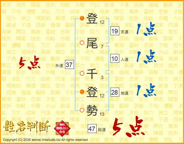 登(12画)尾(7画) 千(3画)登(12画)勢(13画)