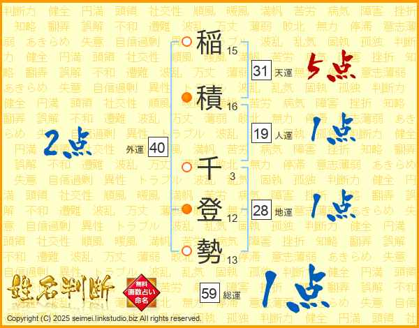 稲積千登勢さんの天運は31画の5点!