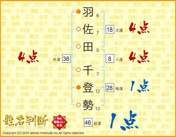 羽(6画)佐(7画)田(5画) 千(3画)登(12画)勢(13画)