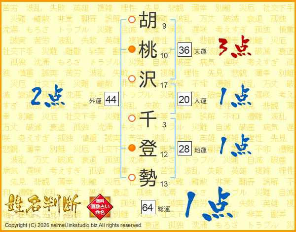 胡(9画)桃(10画)沢(17画) 千(3画)登(12画)勢(13画)