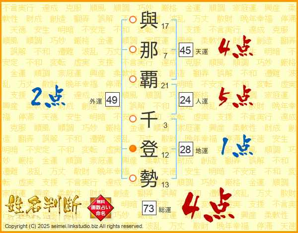 與(17画)那(7画)覇(21画) 千(3画)登(12画)勢(13画)