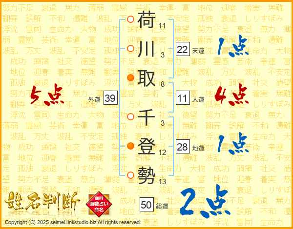 生活面を象徴する運勢です。外部から受ける影響力を表し、結婚運、家庭運や職場、環境への順応性を表します。総運から人運を引いた画数。姓や名が1文字の場合を除く。