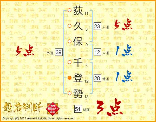 荻(11画)久(3画)保(9画) 千(3画)登(12画)勢(13画)