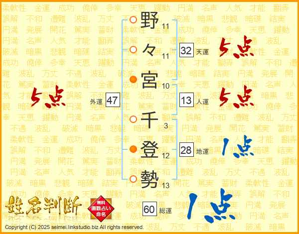 生活面を象徴する運勢です。外部から受ける影響力を表し、結婚運、家庭運や職場、環境への順応性を表します。総運から人運を引いた画数。姓や名が1文字の場合を除く。