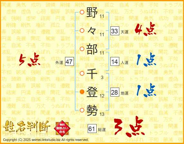 生活面を象徴する運勢です。外部から受ける影響力を表し、結婚運、家庭運や職場、環境への順応性を表します。総運から人運を引いた画数。姓や名が1文字の場合を除く。