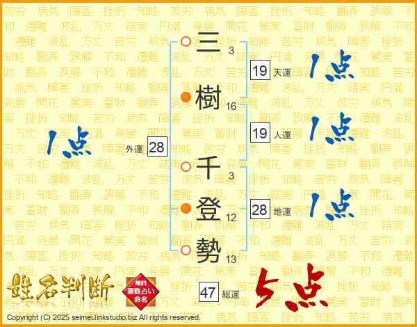 三(3画)樹(16画) 千(3画)登(12画)勢(13画)