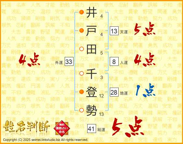 井(4画)戸(4画)田(5画)  千(3画)登(12画)勢(13画)