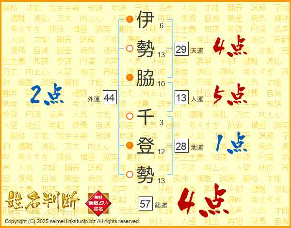 伊(6画)勢(13画)脇(10画) 千(3画)登(12画)勢(13画)