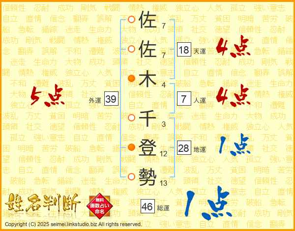 佐(7画)佐(7画)木(4画) 千(3画)登(12画)勢(13画)