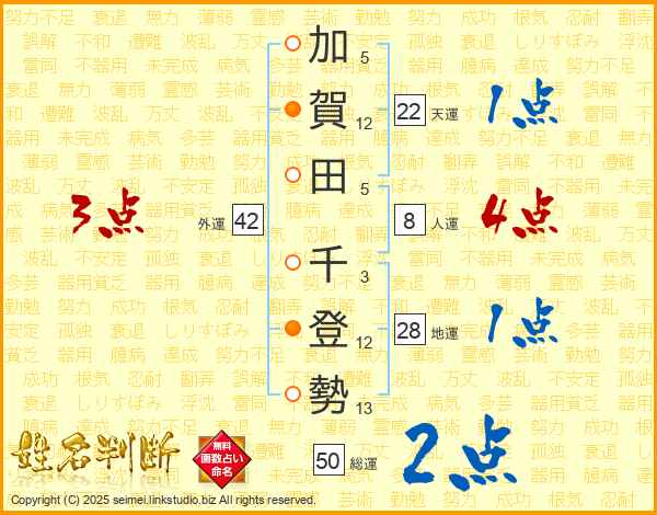 加(5画)賀(12画)田(5画) 千(3画)登(12画)勢(13画)