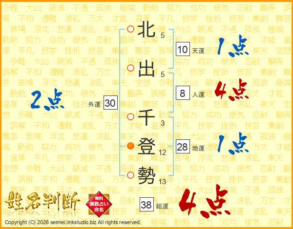 北(5画)出(5画) 千(3画)登(12画)勢(13画)