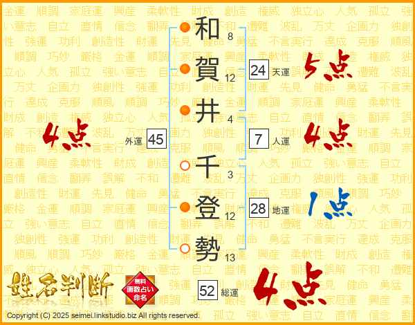 和(8画)賀(12画)井(4画) 千(3画)登(12画)勢(13画)
