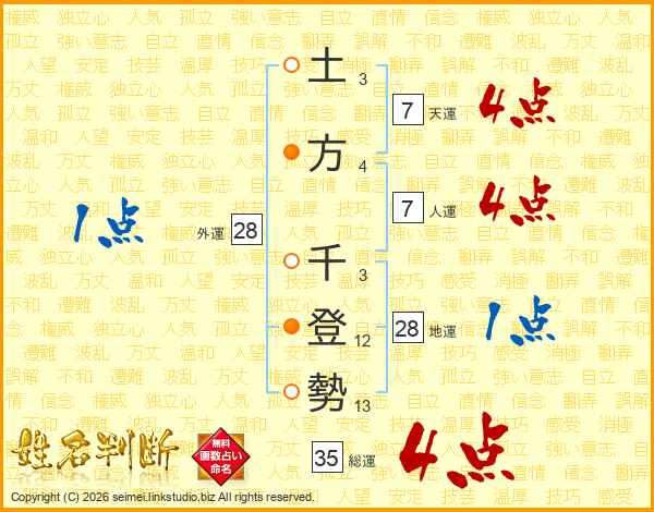 生活面を象徴する運勢です。外部から受ける影響力を表し、結婚運、家庭運や職場、環境への順応性を表します。総運から人運を引いた画数。姓や名が1文字の場合を除く。