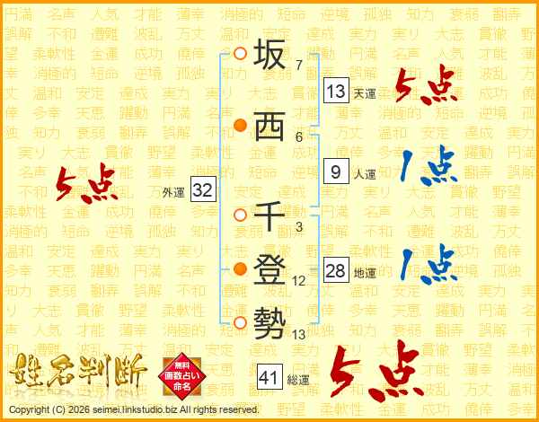 坂(7画)西(6画) 千(3画)登(12画)勢(13画)