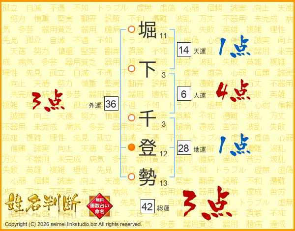 堀(11画)下(3画) 千(3画)登(12画)勢(13画)