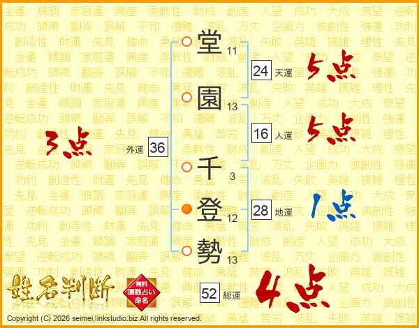 堂(11画)園(13画) 千(3画)登(12画)勢(13画)