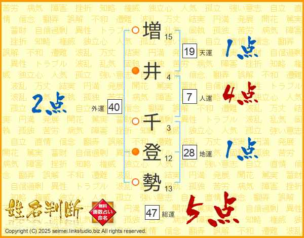 増(15画)井(4画) 千(3画)登(12画)勢(13画)