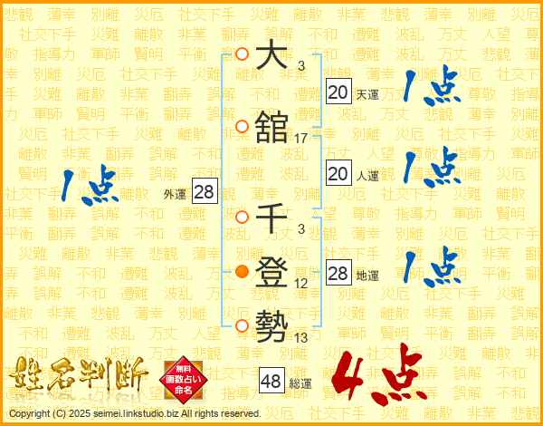 生活面を象徴する運勢です。外部から受ける影響力を表し、結婚運、家庭運や職場、環境への順応性を表します。総運から人運を引いた画数。姓や名が1文字の場合を除く。