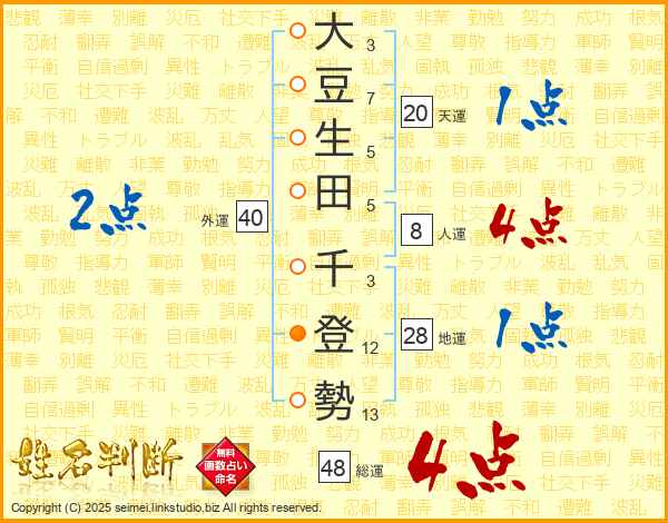 生活面を象徴する運勢です。外部から受ける影響力を表し、結婚運、家庭運や職場、環境への順応性を表します。総運から人運を引いた画数。姓や名が1文字の場合を除く。