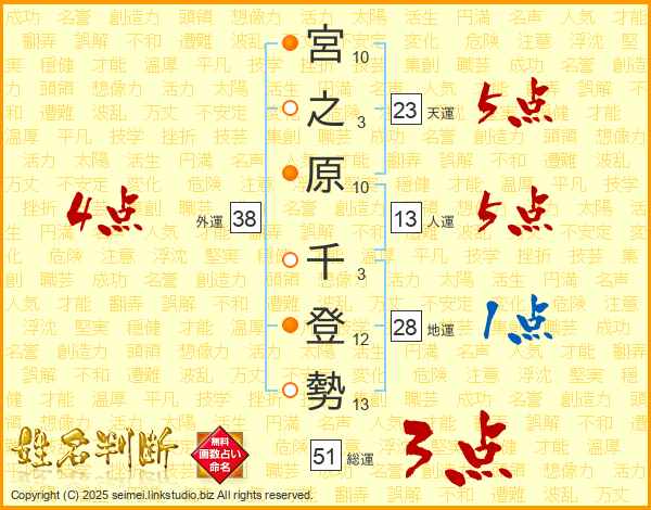 宮(10画)之(3画)原(10画) 千(3画)登(12画)勢(13画)
