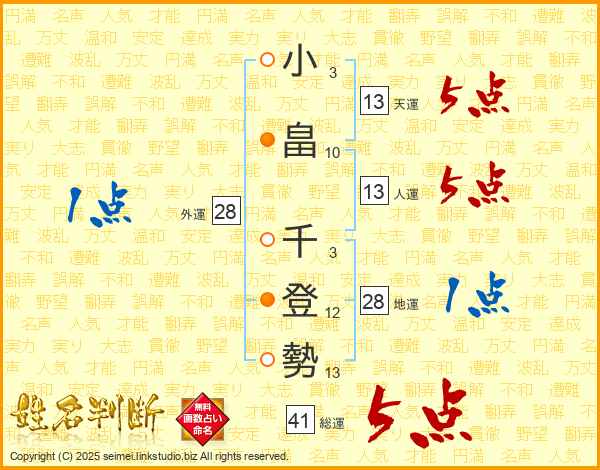 生活面を象徴する運勢です。外部から受ける影響力を表し、結婚運、家庭運や職場、環境への順応性を表します。総運から人運を引いた画数。姓や名が1文字の場合を除く。