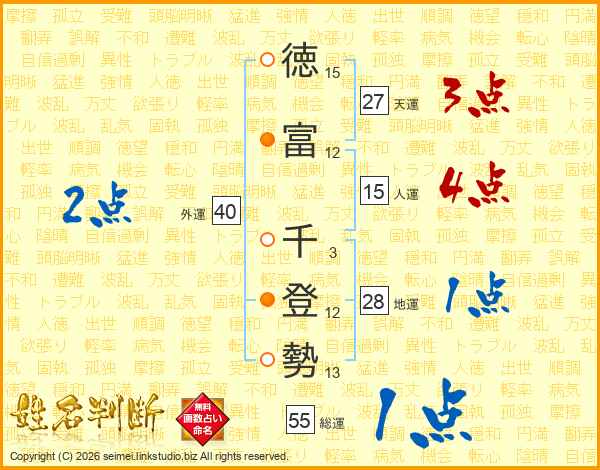 徳(15画)富(12画) 千(3画)登(12画)勢(13画)